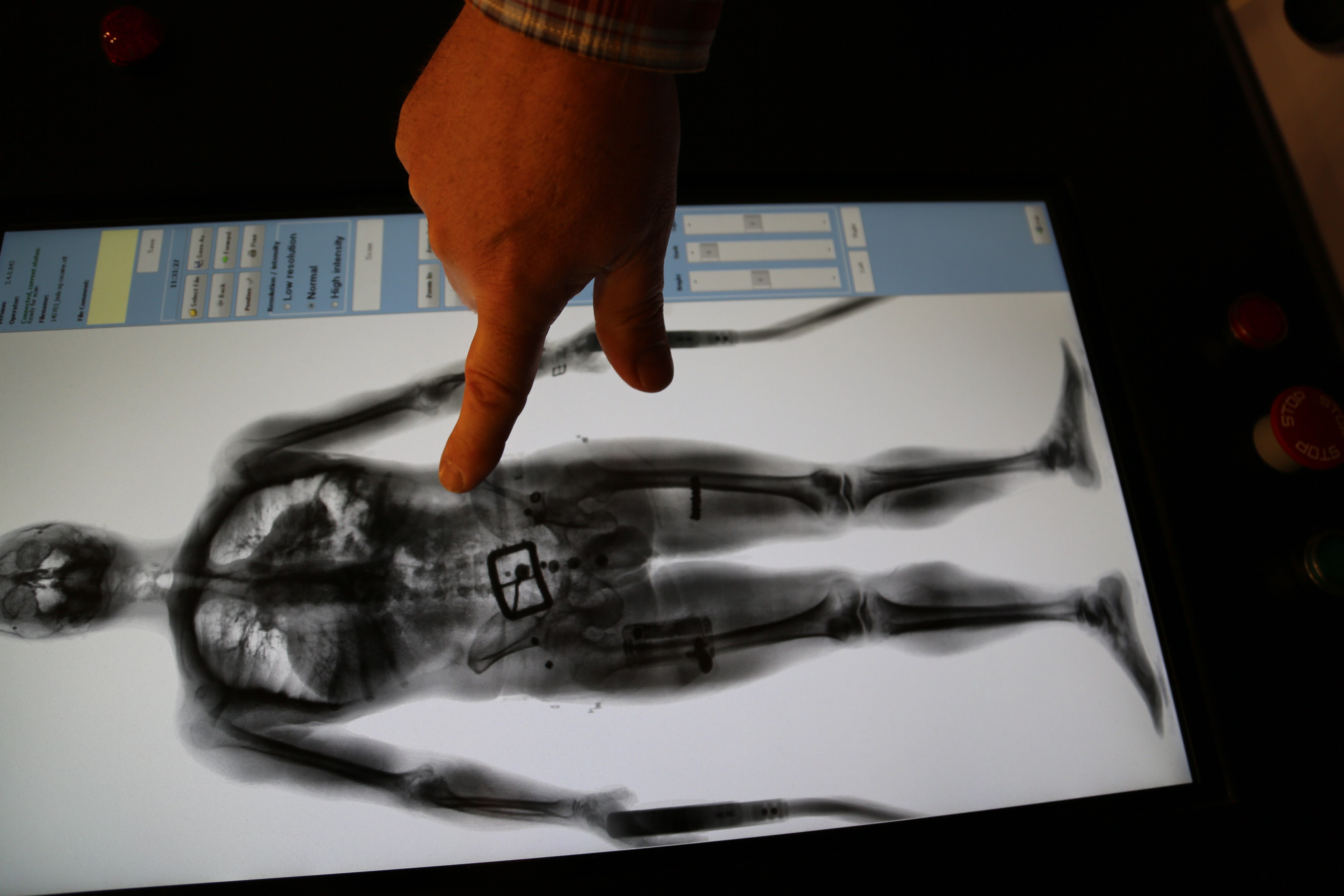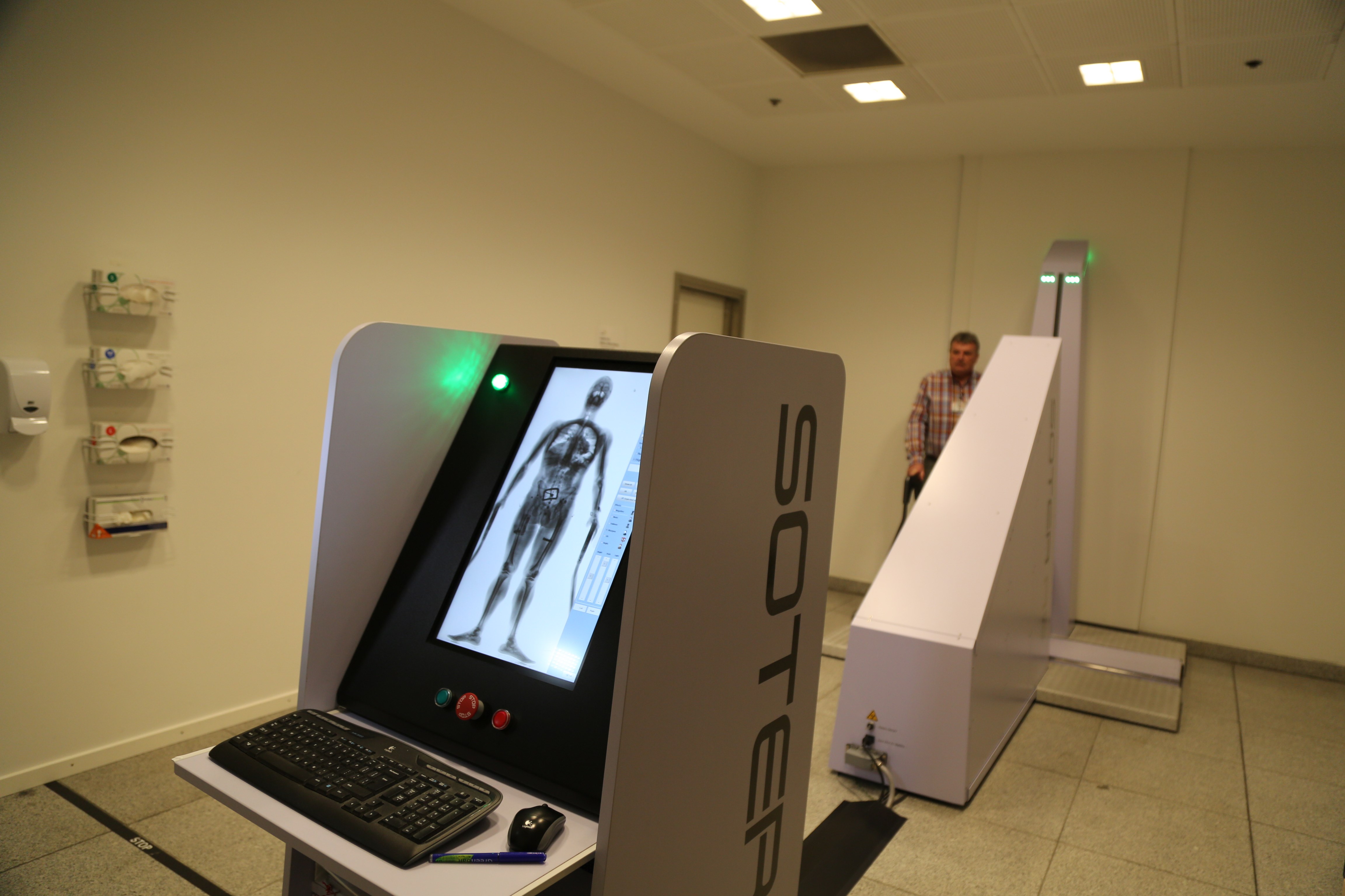 En røntgenscanner fylder et helt rum. Døre og vægge i rummet er sikrede, så røntgenstrålerne ikke trænger ud. Selve scanningen tager ca. 10 sekunder. Strålingen er væsentlig lavere end i de røntgenscannere, man typisk anvender på hospitalerne.