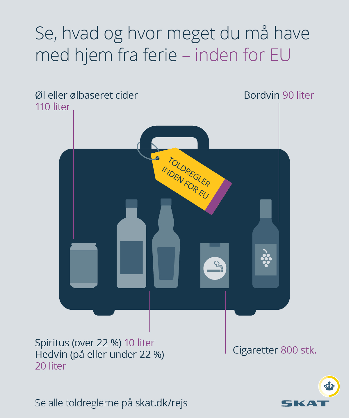 - Der er forskellige regler for, hvor meget man må tage med hjem fra ferien, når det gælder tobak og alkohol alt efter, om man har holdt ferie i et EU-land eller uden for EU. Derfor er det en god idé lige at tjekke reglerne, inden man tager afsted, fortæller underdirektør i SKAT Preben Buchholtz.